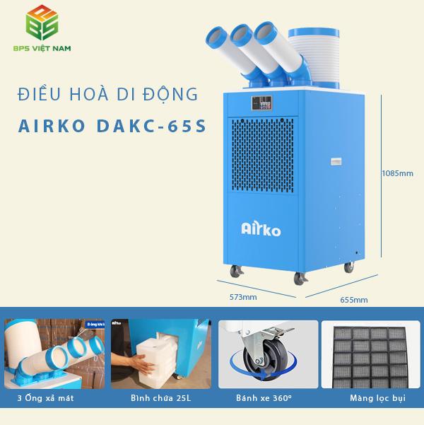 Điều hòa di động công nghiệp Airko DAKC-65S thuộc dòng sản phẩm điều hòa công nghiệp di động, mang đến giải pháp làm mát linh hoạt cho nhà xưởng, khu sản xuất. Với công suất làm lạnh lên tới 6500W tương đương hơn 22.000 BTU , Airko DAKC-65S tự tin cung cấp khả năng làm lạnh hiệu quả cho không gian nhà xưởng lớn, giúp duy trì điều hoà không khí lý tưởng và cải thiện môi trường làm việc.