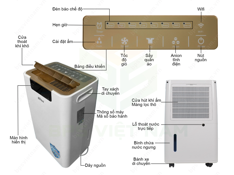Cửa hút khí ẩm ở phía sau máy, cửa thoát khí khô ở phía trên, trang bị bình chứa nước thải 8 lít hoặc dùng ống thoát nước trực tiếp ra ngoài. Airko ER-668EL có bảng điều khiển và màn hình hiển thị thông số chi tiết, giúp khách hàng dễ dàng tùy chỉnh và quan sát chất lượng không khí trong phòng.