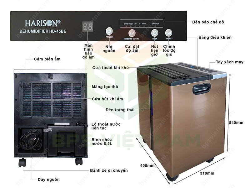 Máy hút ẩm Harison HD-45BE ra đời năm 2017 nâng cấp từ dòng HD-45B, sản phẩm mới sang trọng hơn với màu vàng gold sang trọng. Hệ thống điều khiển điện tử thay thế cho dạng cơ trước đó, được đánh giá là tiện lợi và dễ sử dụng hơn.