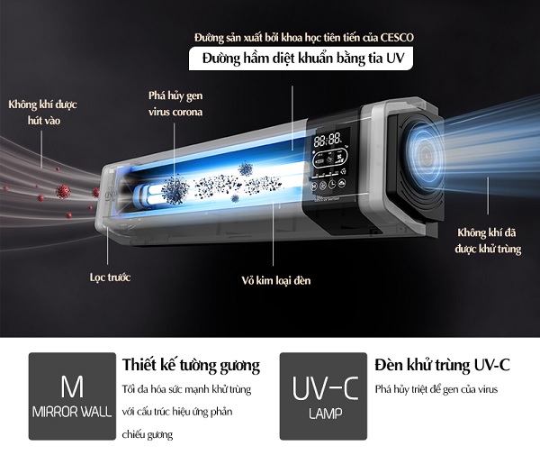 Với lực hút mạnh mẽ, Cesco Sterilizer đưa lượng lớn không khí vào máy, đi qua bộ lọc Carbon để loại bỏ mùi, còn lại vi khuẩn, virus sẽ được phá hủy bằng đường hầm tia UV. Với cơ chế tác động trực tiếp lên vi khuẩn gây hại, phá vỡ cấu trúc DNA, nhờ đó tiêu diệt hoàn toàn vi khuẩn trước khi đẩy không khí ra ngoài. Đường hầm tia UV thiết kế theo dạng hình chữ S, kết hợp thêm cấu trúc thành gương, giúp giữ lại không khí trong máy lâu hơn để xử lý tận gốc.