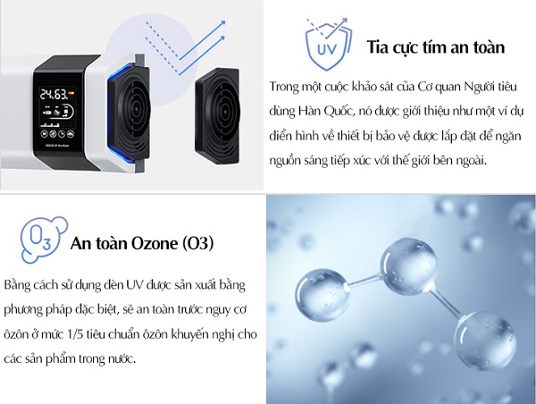 Tia UV hay còn gọi là tại ozone, tia cực tím, nhiều người lo ngại thiết bị phóng ra tia này sẽ ảnh hưởng tới sức khỏe con người. Tuy nhiên, ozone trong thiết bị Sterilizer được sản xuất theo phương pháp đặc biệt, với nồng độ 0,009ppm (tương đương 1/5 lần so với mức khuyến nghị dành cho các sản phẩm trong nước), vì vậy an toàn tuyệt đối cho người sử dụng.