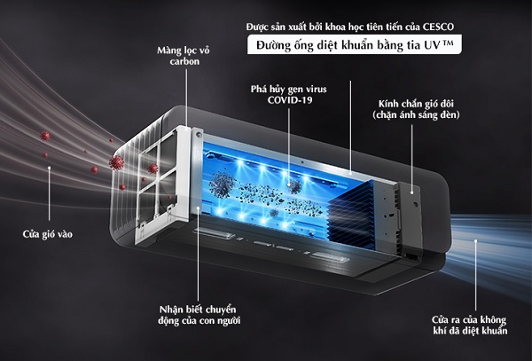 Cesco Sense Me VS-510M hoạt động theo nguyên lý hút không khí vào trong, đi qua bộ lọc Carbon, sau đó không khí được dẫn vào đường ống diệt khuẩn. Tại đường ống này sử dụng nhiều đèn UV-C để tiêu diệt virus, vi khuẩn, mầm bệnh. Không khí sạch được đẩy ra ngoài đảm bảo sạch khuẩn đến 99,99%, bảo vệ sức khỏe người dùng.