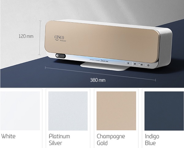Cesco Sense Me VS-510M có kích thước 380(W) x 138(D) x 120(H) mm, với 4 màu sắc để bạn lựa chọn: màu trắng (White), màu bạc ánh kim (Platinum Silver), màu vàng kim (Champagne Gold), màu chàm (Indigo Blue). Với bảng màu hiện đại, tinh tế, sản phẩm tương thích với nhiều không gian nội thất, phù hợp với thói quen tiêu dùng tại Việt Nam.