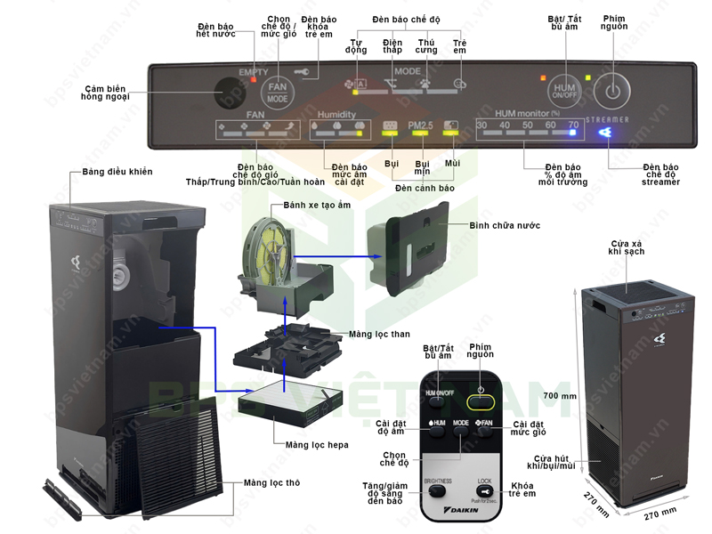 Lọc khí: 7 / 10 / 17 / 56 Tạo ẩm: 9 / 14 / 19 / 58 |