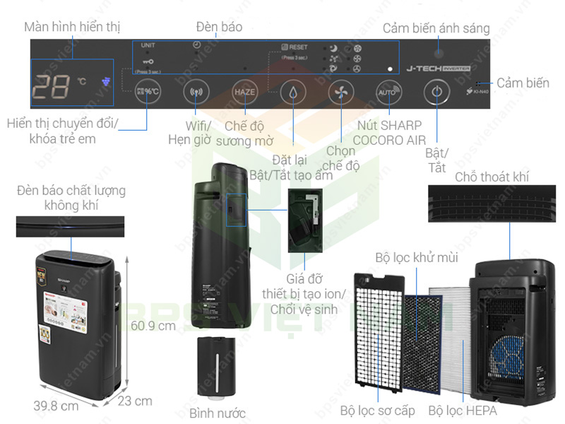 - Sharp KI-N40V-H trang bị hệ thống lọc cao cấp 3 bước gồm: Màng lọc Hepa, màng lọc khử mùi kép có tuổi thọ lên đến 10 năm, màng lọc bụi thô có tuổi thọ vĩnh viễn.